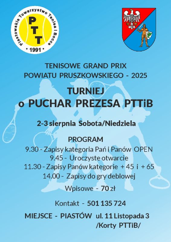 W sobotę i niedzielę, 2-3 sierpnia, przy pięknej pogodzie rozegrano kolejny turniej z cyklu Grand Prix Powiatu Pruszkowskiego w Tenisie- 2025. Tym razem grano o Puchar Prezesa PTTiB Pana Andrzeja Makowskiego, który w sobotni poranek dokonał uroczystego otwarcia. Gry przebiegały w miłej i sportowej atmosferze.