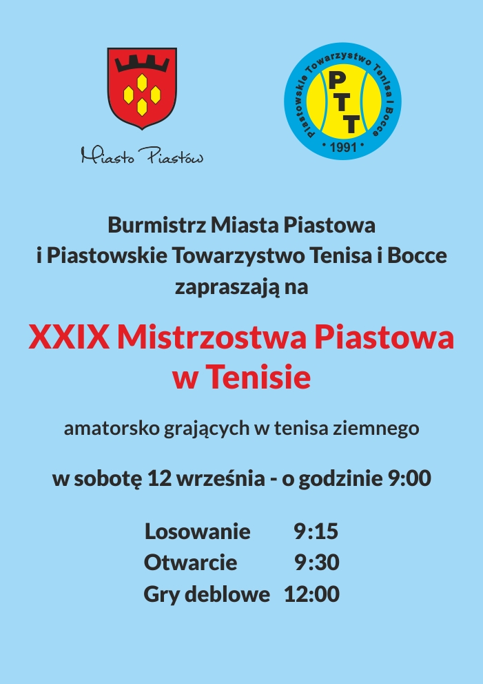 W dniach 15-16 września na obiektach Piastowskiego Towarzystwa Tenisa i Bocce zorganizowano XXVII Mistrzostwa Piastowa w Tenisie i X Mistrzostwa w Bocce dla dorosłych. W kategoriach dziecięcych mecze rozegrano wcześniej. W sobotni poranek zawody otworzył Burmistrz Piastowa Pan Grzegorz Szuplewski. Po niedzielnych finałach puchary i medale dla finalistów poszczególnych kategorii wręczali Burmistrz Piastowa Pan Grzegorz Szuplewski i Prezesi PTTiB Panowie Andrzej Makowski i Zbyszek Stanecki. Prowadzącymi turnieje i sędziami z ramienia PTTiB byli Panowie Mirosław Pabijanek i Leszek Grabarczyk.